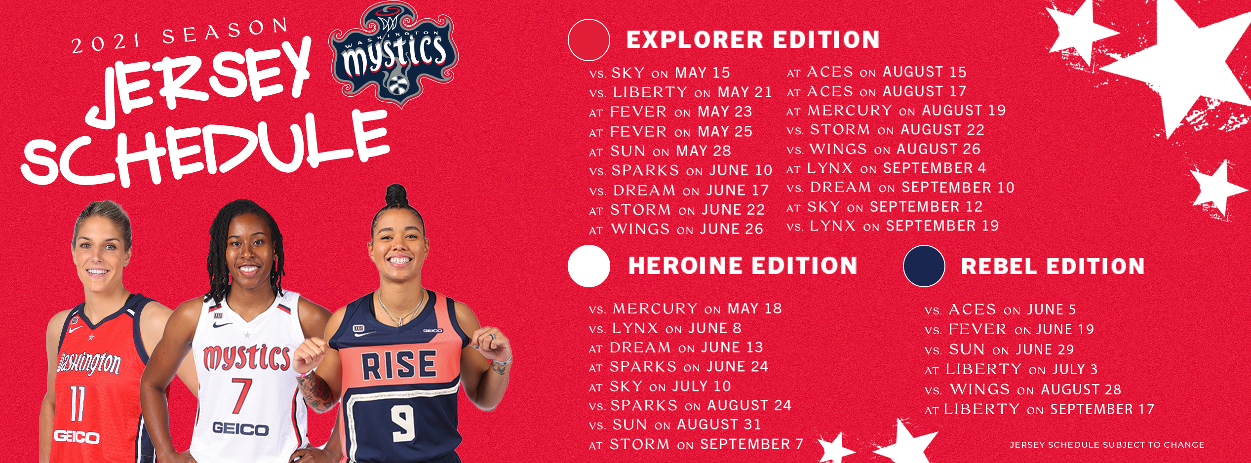 This season, your Mystics have shown off an impressive collection of kicks. The latest player kicks include All-Star Brittney Sykes debuting the “Crown Jewel: Chief Hela” Anti Kai 1 by Kyrie Irving at the 2025 WNBA All-Star Game in Indianapolis. Stefanie Dolson turned her love for Wicked into an exclusive wicked-cool “Jordan Luka 4” PE’s in a green and pink colorway. Dolson debuted her shoes at the team’s Wicked on Broadway Night game. Check out the player sneaker gallery to see these kicks and others worn by the team!